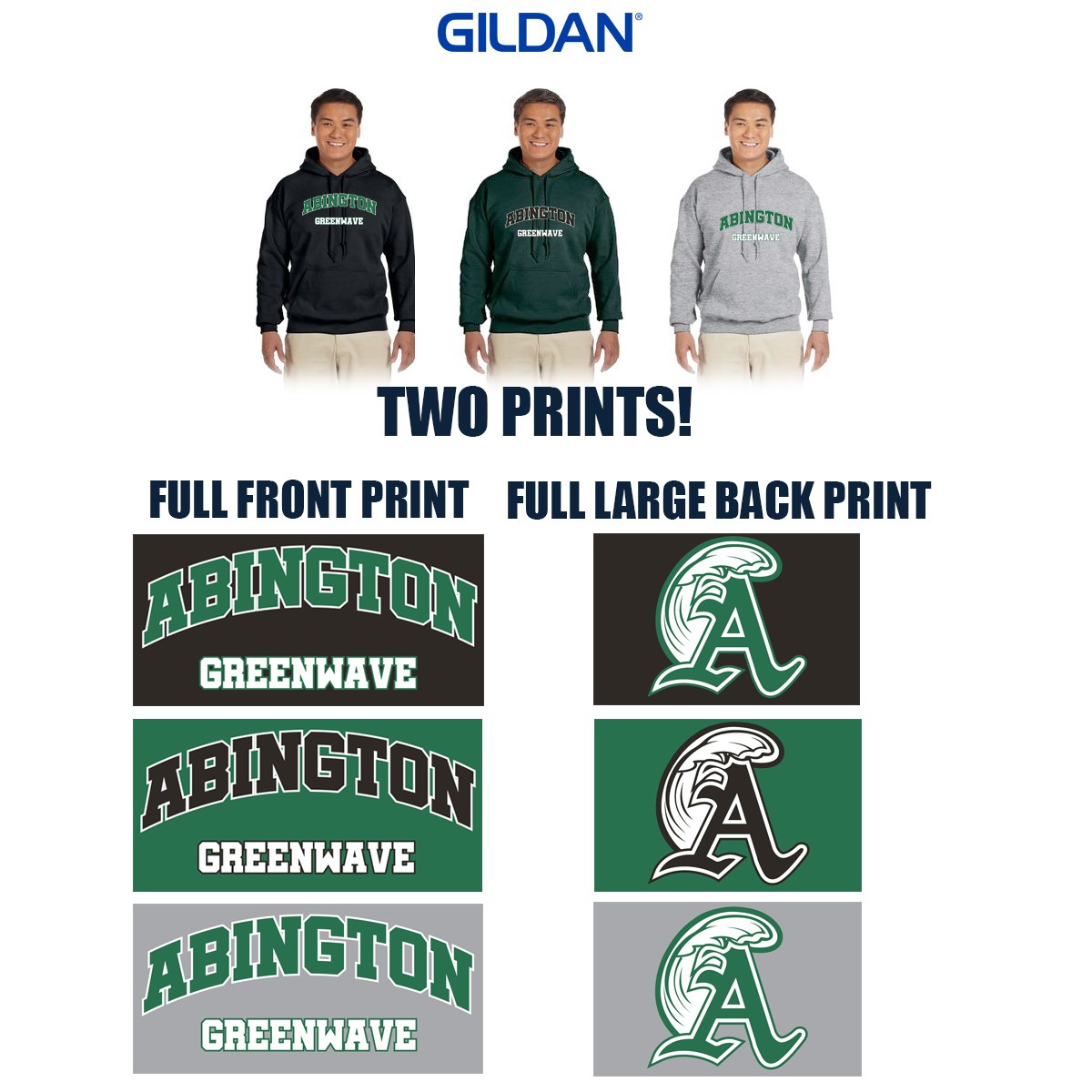 1st Location: Silkscreen 2 color Full Front, Abington Greenwave Arched/Straight Text, White with Black or Forest Green (depending on color)
