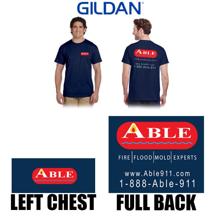 2nd location: Multicolor 4-color silkscreen full back print, ABLE logo with website and phone number on the back