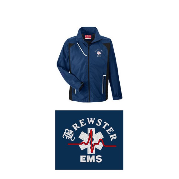 Imprint: Navy goods get: 1 location-2 color left chest “Brewster EMS” standard logo in white and red embroidered thread