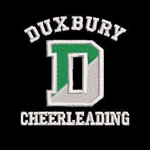 Imprint: 1 location embroidery left hip- “Duxbury Cheerleading” text in athletic white font around a collegiate athletic split “D” logo in white and green