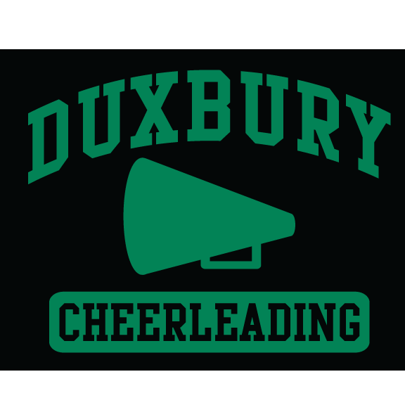 Imprint: 1 location silkscreened 1 color full front green “Duxbury Cheerleading” logo with solid megaphone and “Duxbury” arched over it, and “Cheerleading” straight across as a knockout in a round cornered bar.