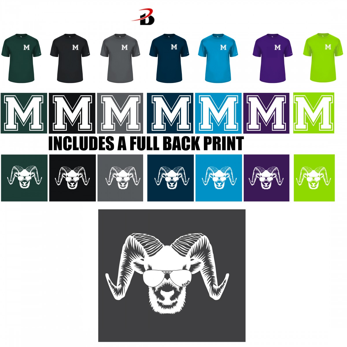 Imprint: 2 silkscreen locations, both 1 color STOCK WHITE ink, “M” (left Chest), Male Ram in shades (Full Back)
