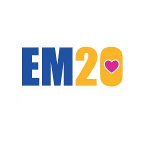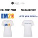 1st location: 3 color silkscreened imprint, full front, EM•20 logo, pms colors provided