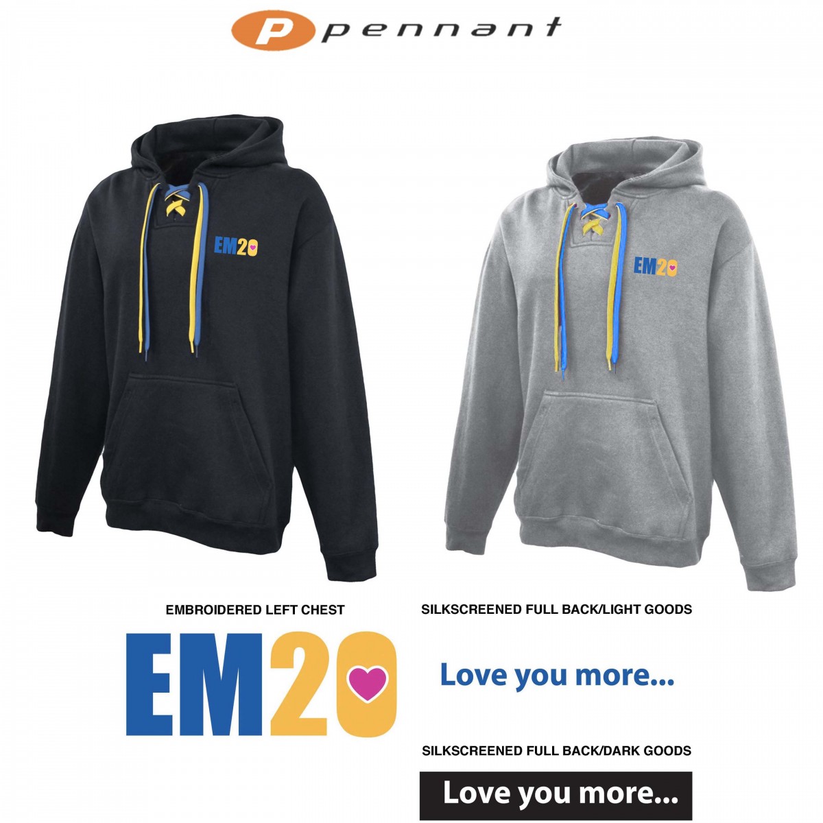 2nd location: 1 color silkscreened imprint, full back, either PMS blue (provided) or white ink, “Love You More” text