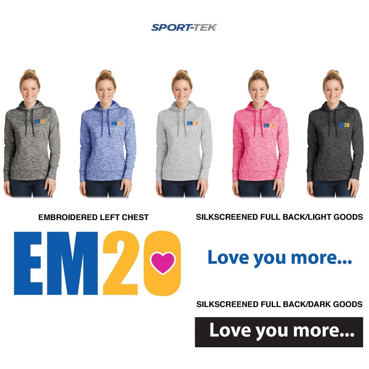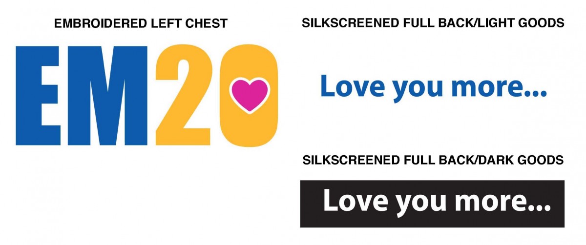 1st location: multicolor left chest embroidery, EM•20 logo, pms colors provided
