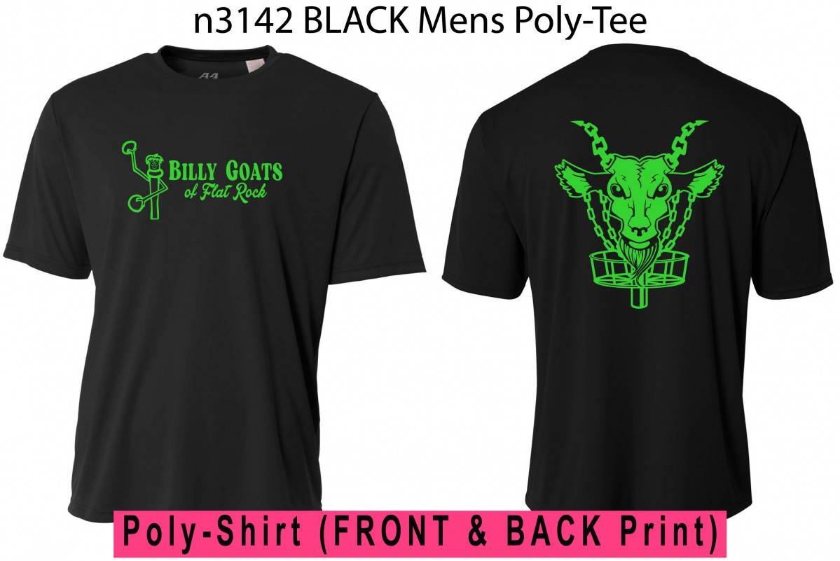 Item: Flat Rock Billy Goats Disc Golf A4 Cooling Performance Crew, Men’s Fit, Black With 2 Prints