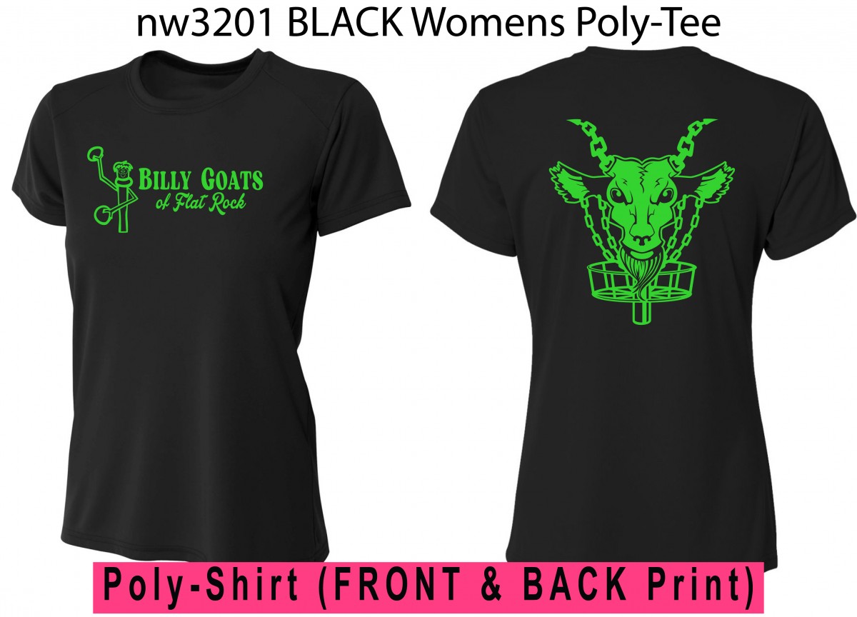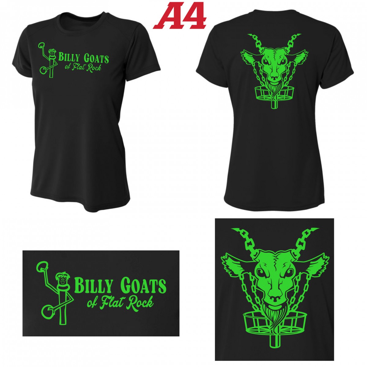 Item: Flat Rock Billy Goats Disc Golf A4 Women’s Cooling Performance Crew, Women’s Fit, Black with 2 Prints