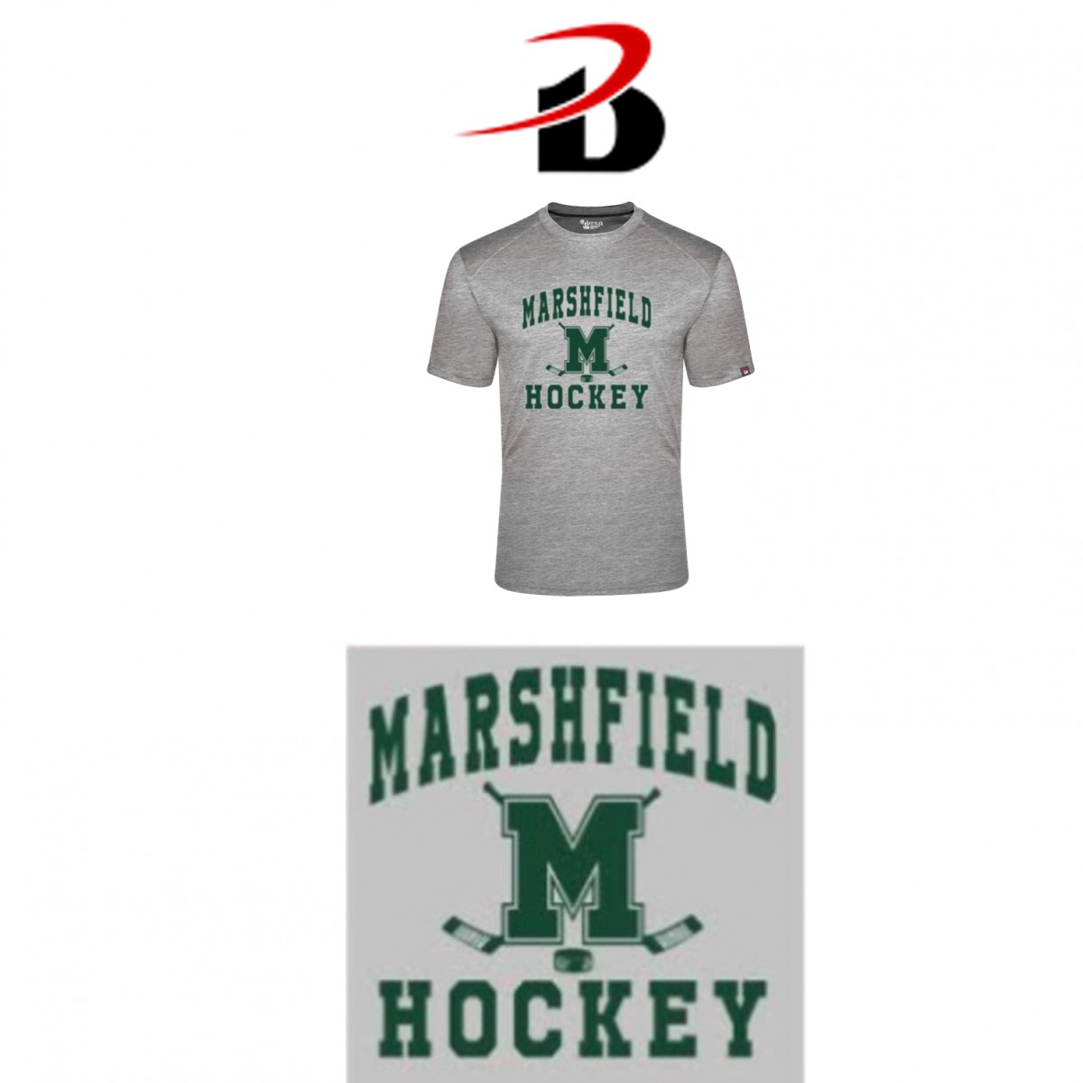 Item: Friends Of Marshfield Hockey Badger Performance Fit Flex Tee, Crossed Sticks Logo