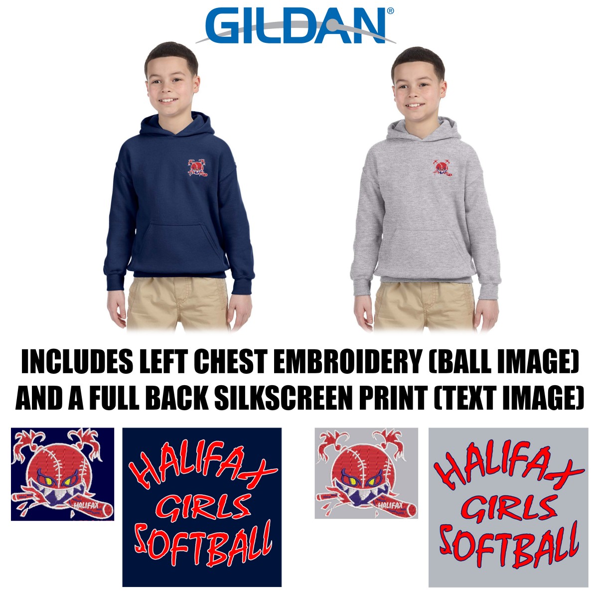 Item: Halifax Girls Softball Gildan Youth Heavy Blend™ 8 oz., 50/50 Hooded Sweatshirt