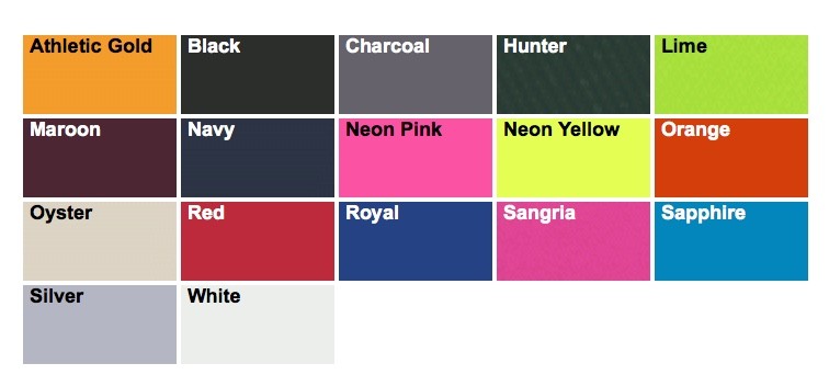 Color: Athletic Gold, Black, Charcoal, Hunter, Lime, Maroon, Navy, Neon Pink, Neon Yellow, Orange, Oyster, Red, Royal, Sangria, Sapphire, Silver, White