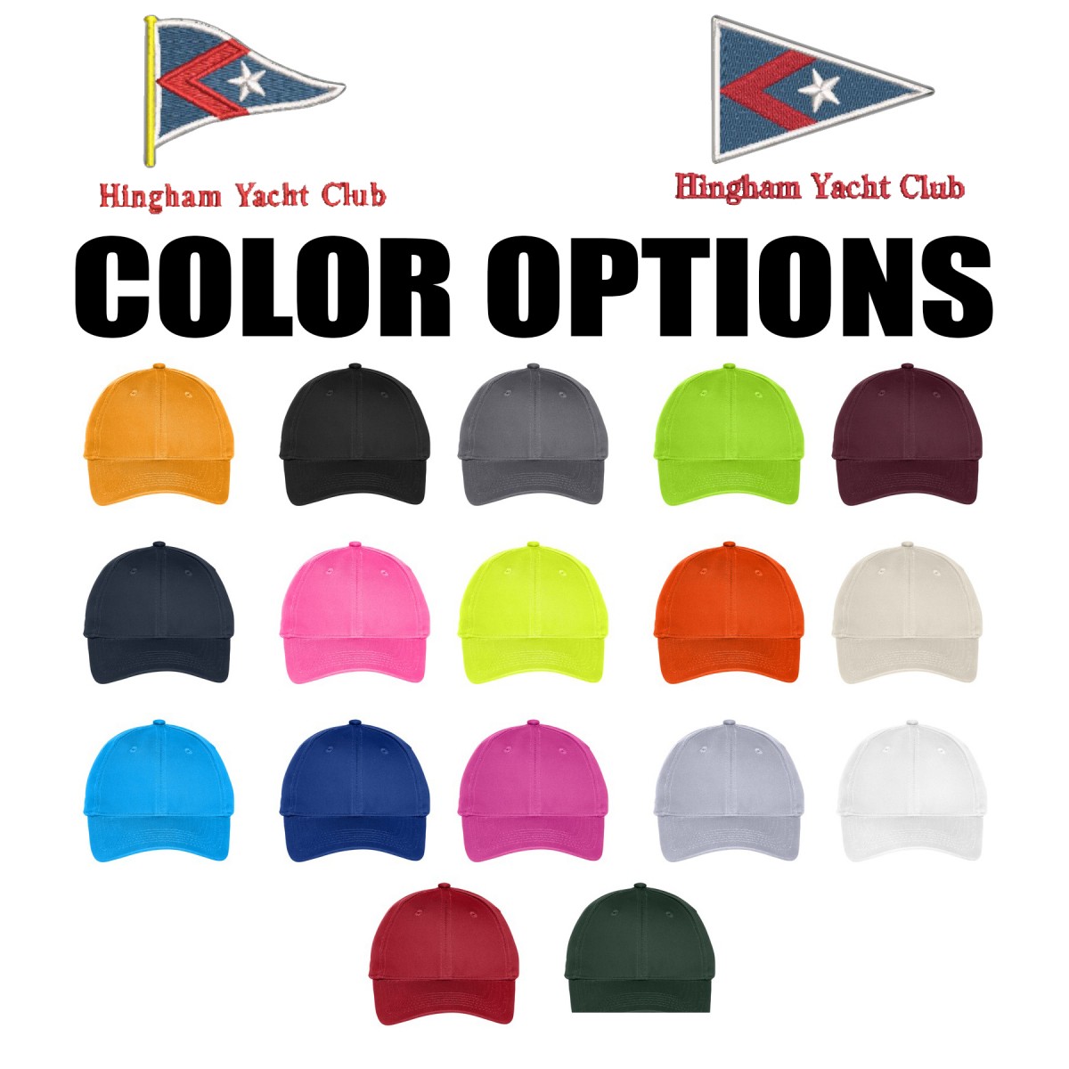 Imprint: OPTION: Hingham Yacht Club logo, embroidered, center hat location, either straight burgee or wavy burgee version