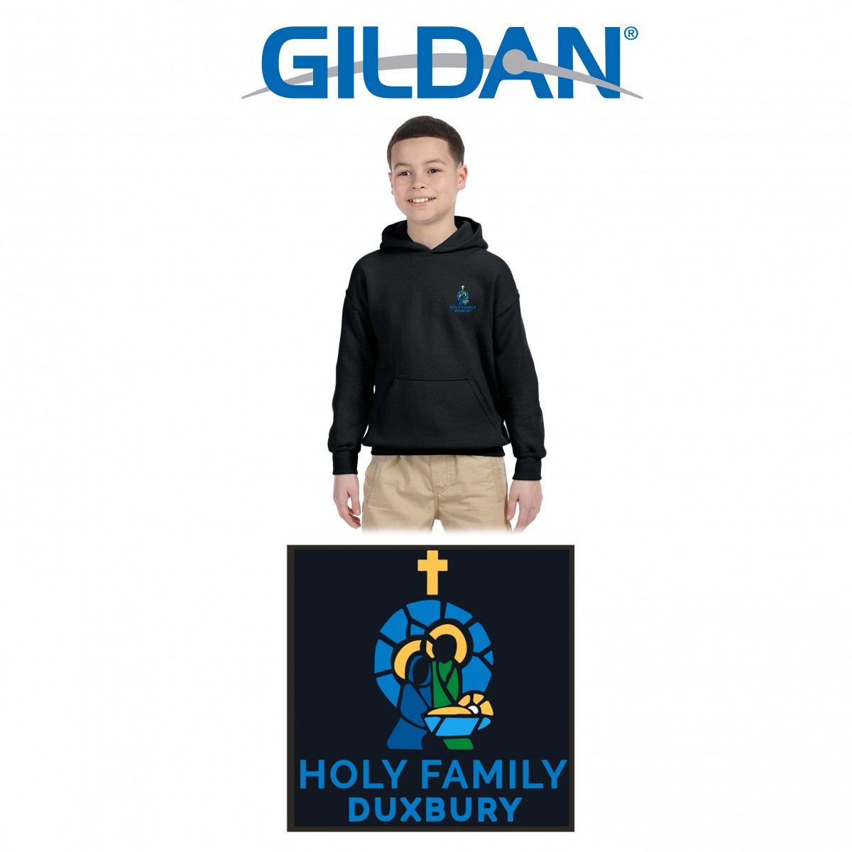 Item: Holy Family Duxbury Gildan Youth Heavy Blend™ 8 oz., 50/50 Hood, Embroidered
