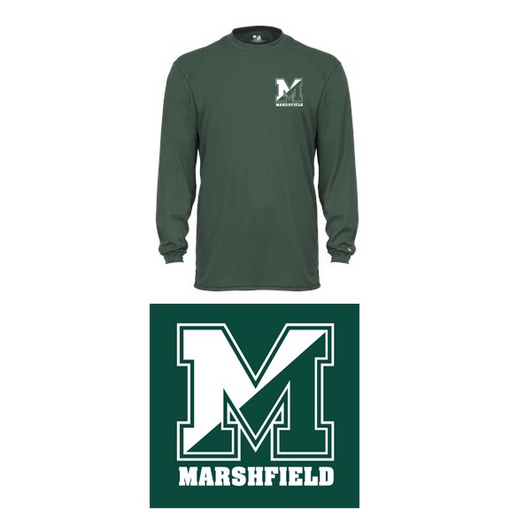 Imprint: 1 location 1 color collegiate style silkscreened left chest “M” with “MARSHFIELD” text below it, white ink