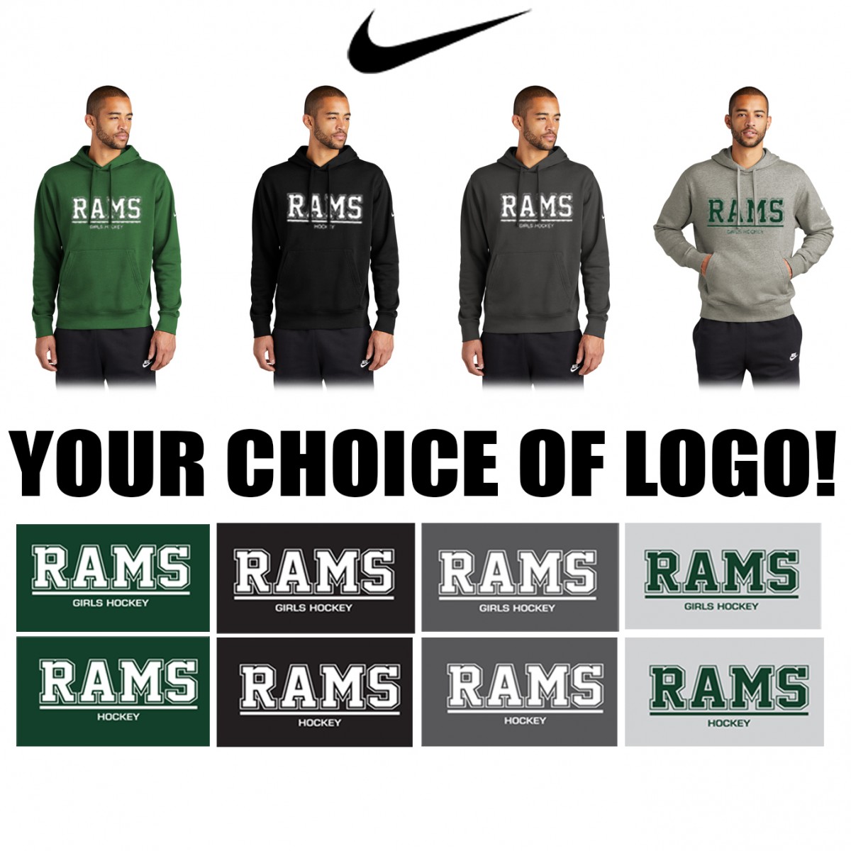 1st option: 1 color silkscreen full front RAMS logo, with “GIRLS HOCKEY” text