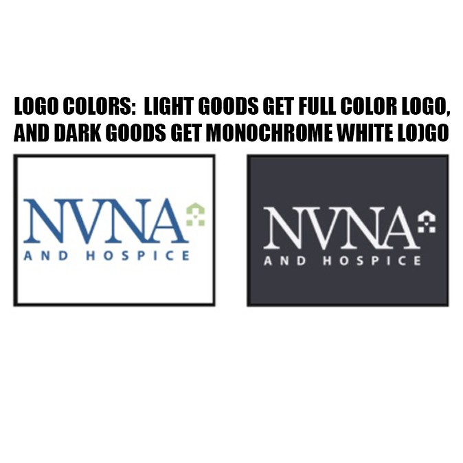 Imprint: Left hip 1 location NVNA & Hospice logo, embroidered, in white on dark goods, or navy & green on light goods.