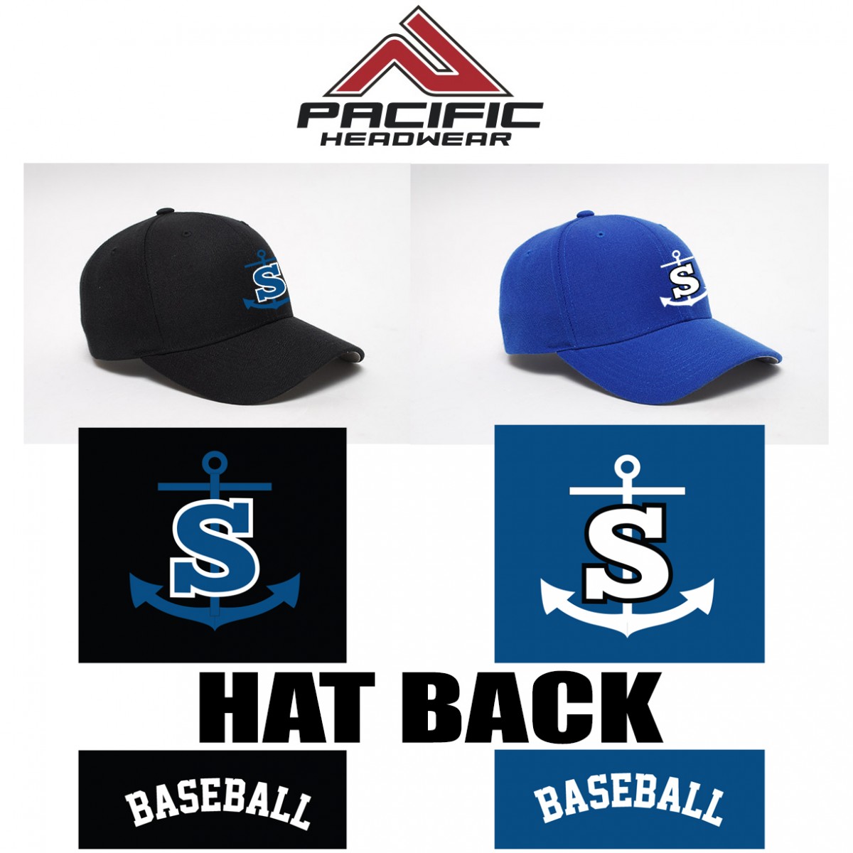 Imprint: Embroidered- 2 locations, “S” with anchor on front (no text), “Baseball” in athletic text on back (arched)