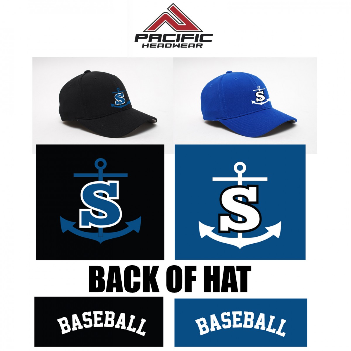 Imprint: Embroidered- 2 locations, “S” with anchor on front (no text), “Baseball” in athletic text on back (arched)