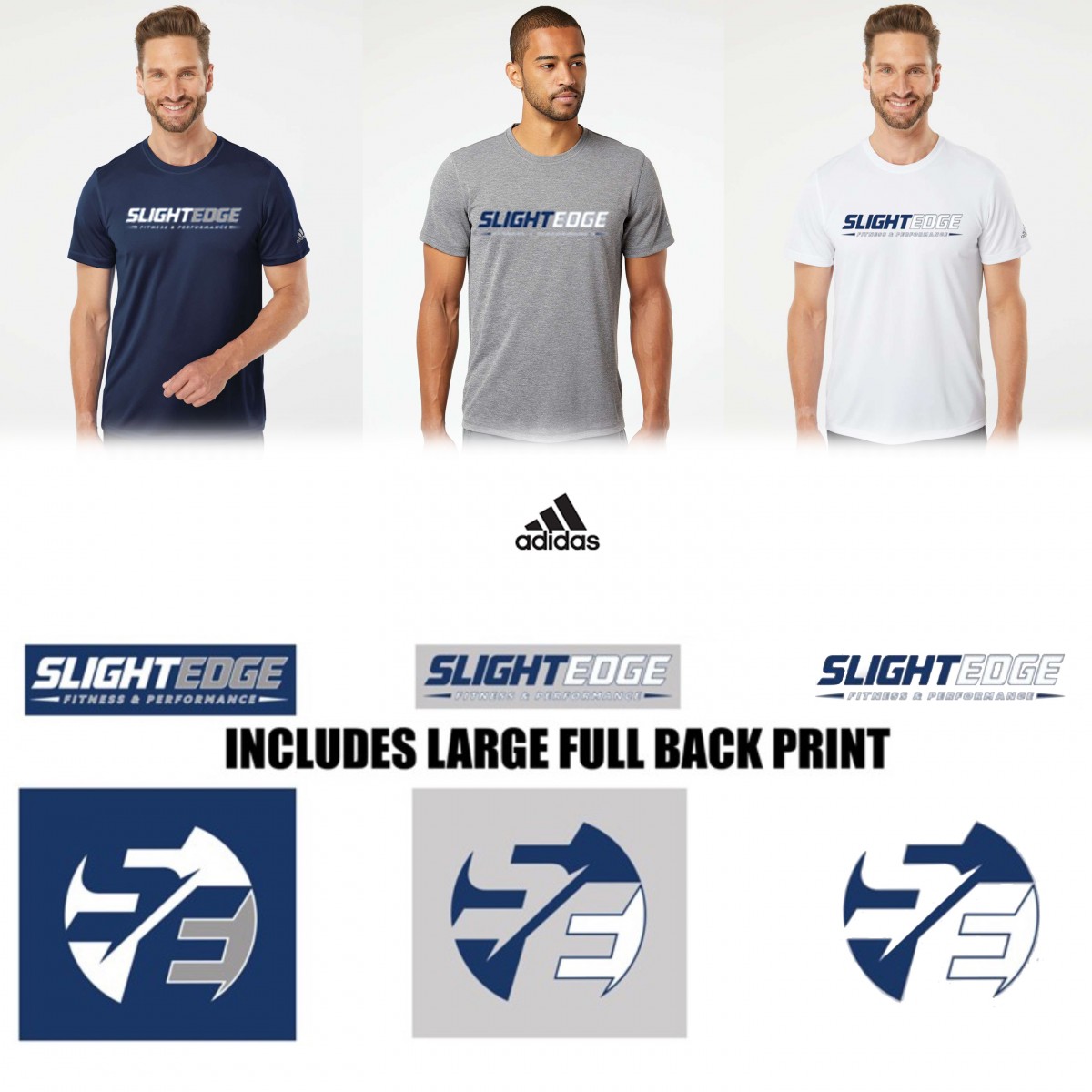 1st location 2 color full front silkscreen logo, SLIGHT EDGE Fitness & Performance text logo in white and navy or white and gray ink