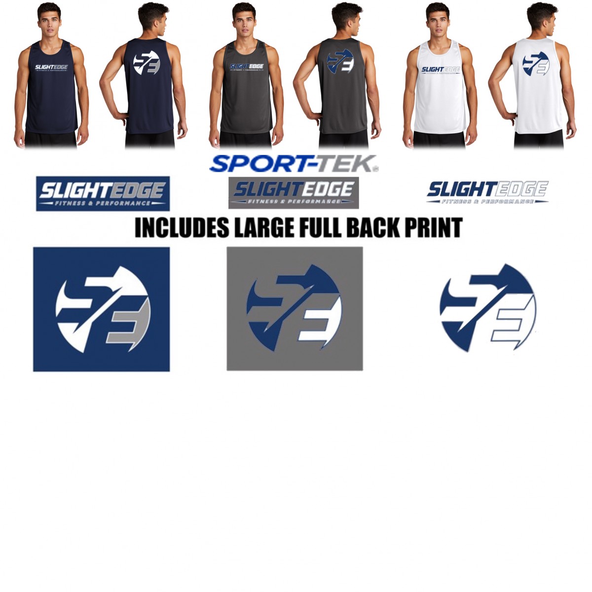 1st location 2 color full front silkscreen logo, SLIGHT EDGE Fitness & Performance text logo in white and navy or white and gray ink