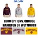 1 color silkscreen full front imprint, “HAMILTON” text with paw print or “WEYMOUTH” text with paw print, Maroon or Athletic Gold print