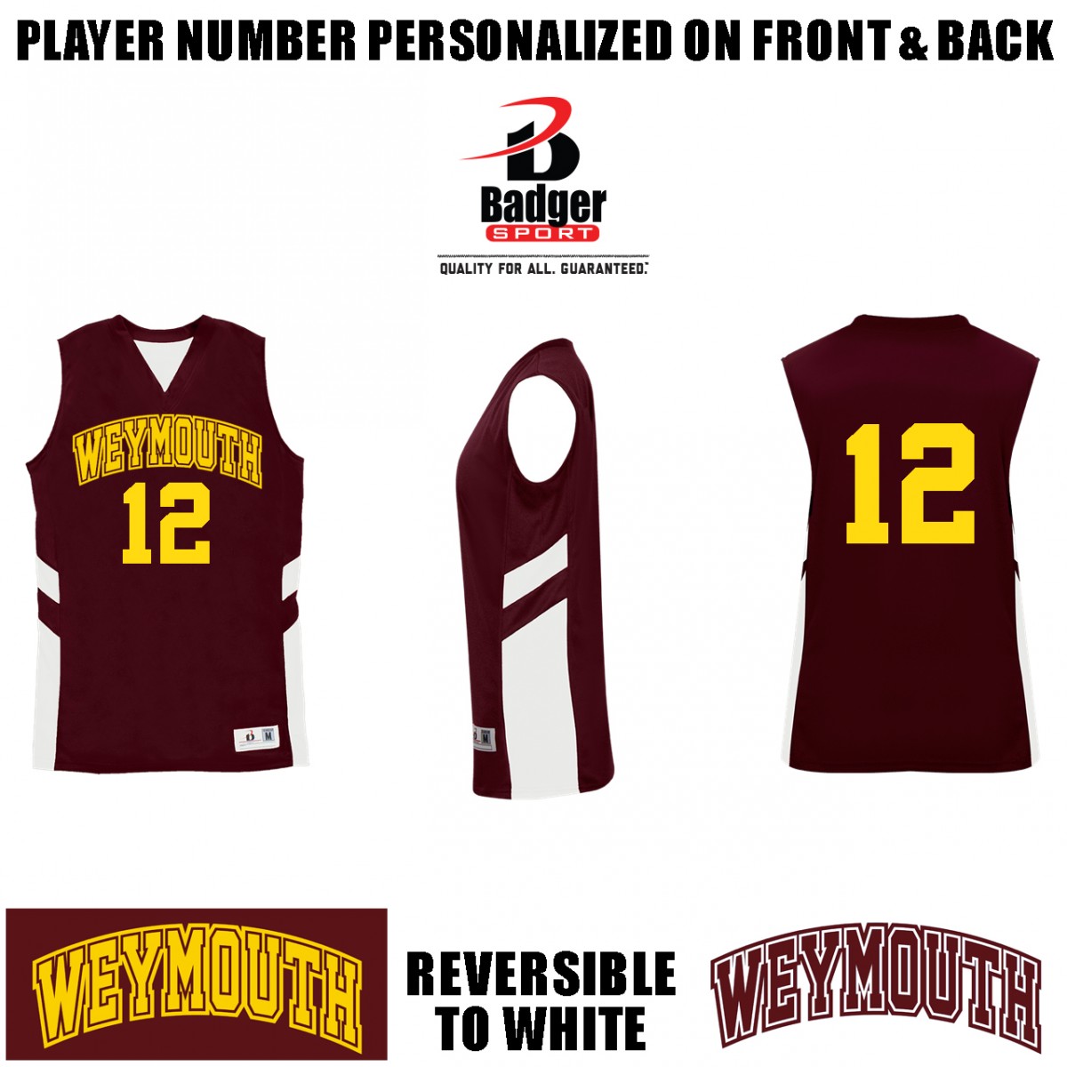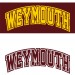 Front 1: 1 color full front, Screened, “WEYMOUTH” text logo,1 color, maroon ink on white side, gold ink on maroon side